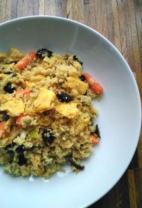 Tenía olvidado del cuscús y la verdad es que me encanta y es muy rápido de preparar, pero por algún motivo solo me acordaba de él para hacerme sopas. Esta semana, en mi planing semanal (sí, yo también me hago un menú semanal para que sea todo más fácil), había puesto para hoy arroz tres delicias, pero entonces por arte de magia recordé el cuscús y decidí darle algún toque más de sabor, añadiendo aceitunas, uvas pasas, curry… Así que de ahí el nombre: cuscús «tipo» tres delicias.